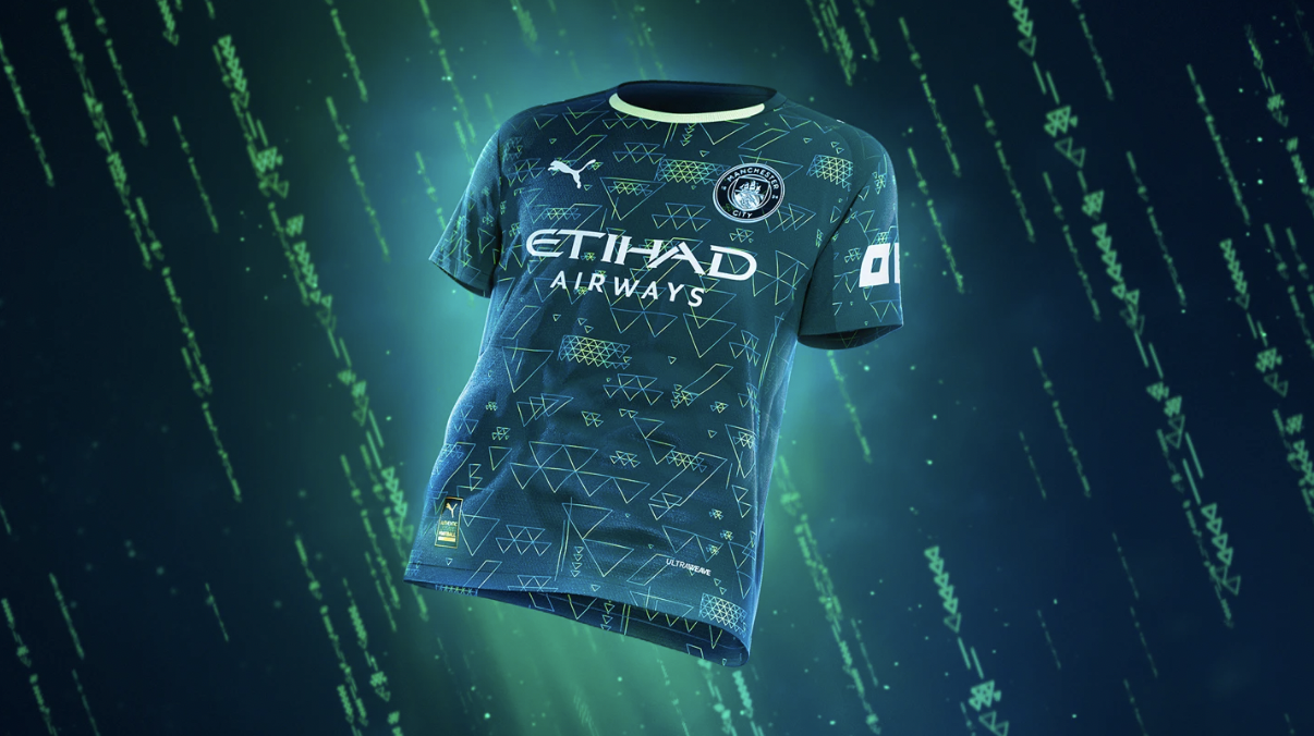 The striking new strip – a collaboration between City, PUMA, and EA SPORTS FC – represents a fusion of football tradition and digital innovation, with a design showcasing a dark forest green base with turquoise and metallic triangular graphics.